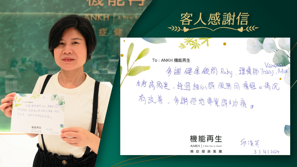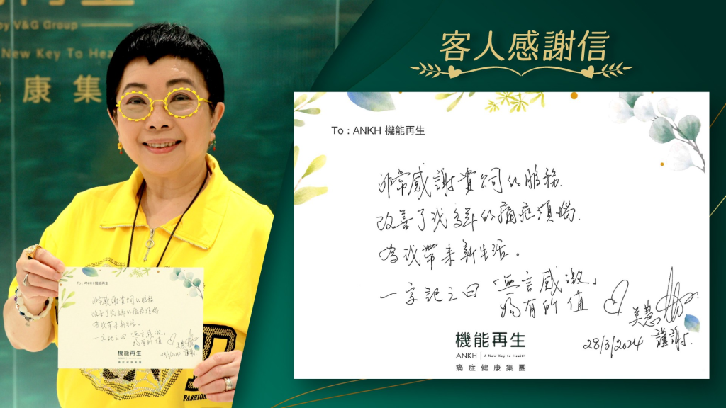「非常感謝貴公司的服務改善了我多年的痛症煩惱,為我帶來新生活。一字記之曰:「無言感激」,物有所值。」