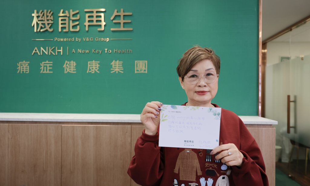 經歷過這一次肩周炎,伍小姐認為健康相當珍貴:「健康比金錢重要,保養身體是人生大事。現在我都會主動推薦 ANKH 機能再生給身邊有痛症困擾的朋友。」