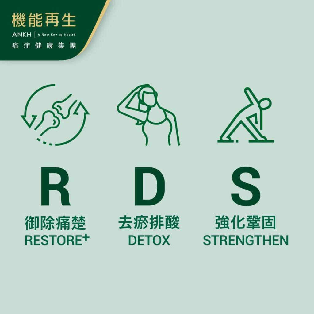 ANKH機能再生的跨領域專業團隊會為受肩周炎困擾人士進行詳細評估,了解成因與徵兆,再制定個人化的「RDS+極速御痛技術」療程方案,立即登記限量體驗名額揮別肩周炎。