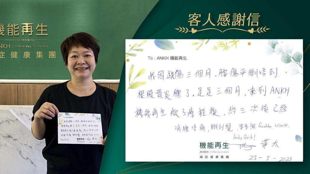 「我因跌傷,腰傷平瞓唔到,筋膜腫了,足足三個月。來到ANKH機能再生做了療程後,約三次後已經消腫唔痛,瞓到覺!」