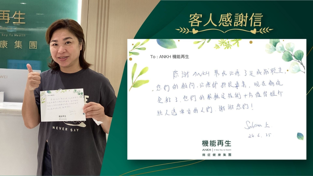 「感謝ANKH幫我理療了足底筋膜炎,您們的顧問、理療師都很專業,現在痛症全好了,您們的服務及技術十分值得推介給身邊需要的人們,謝謝您們! 」
